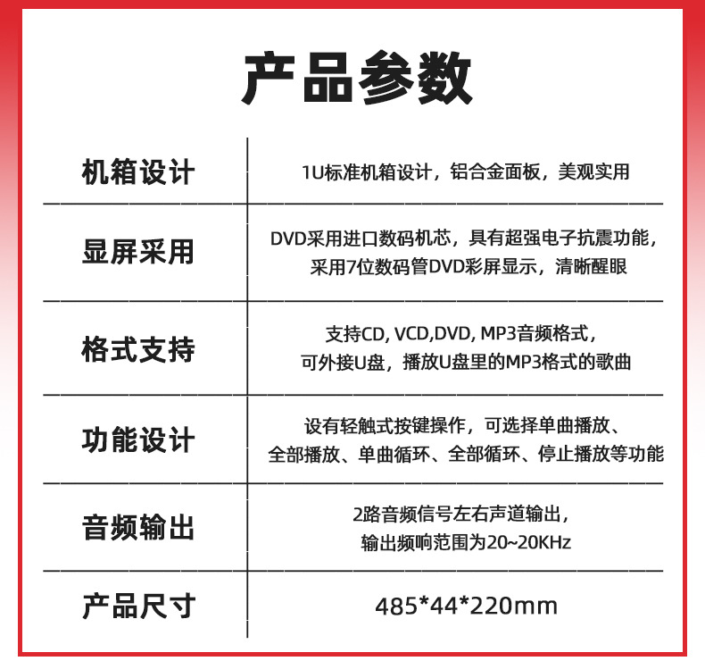 详细信息 商品属性 品牌 播放格式 碟机种类 额定电压 额定功率 额定频率 光盘放入方式 货号 型号 音箱接口 有无显示屏 材质 3C证书编号 货源类别 物流服务 上市时间 最高功率 产品规格 是否跨境出口专供货源 商品描述