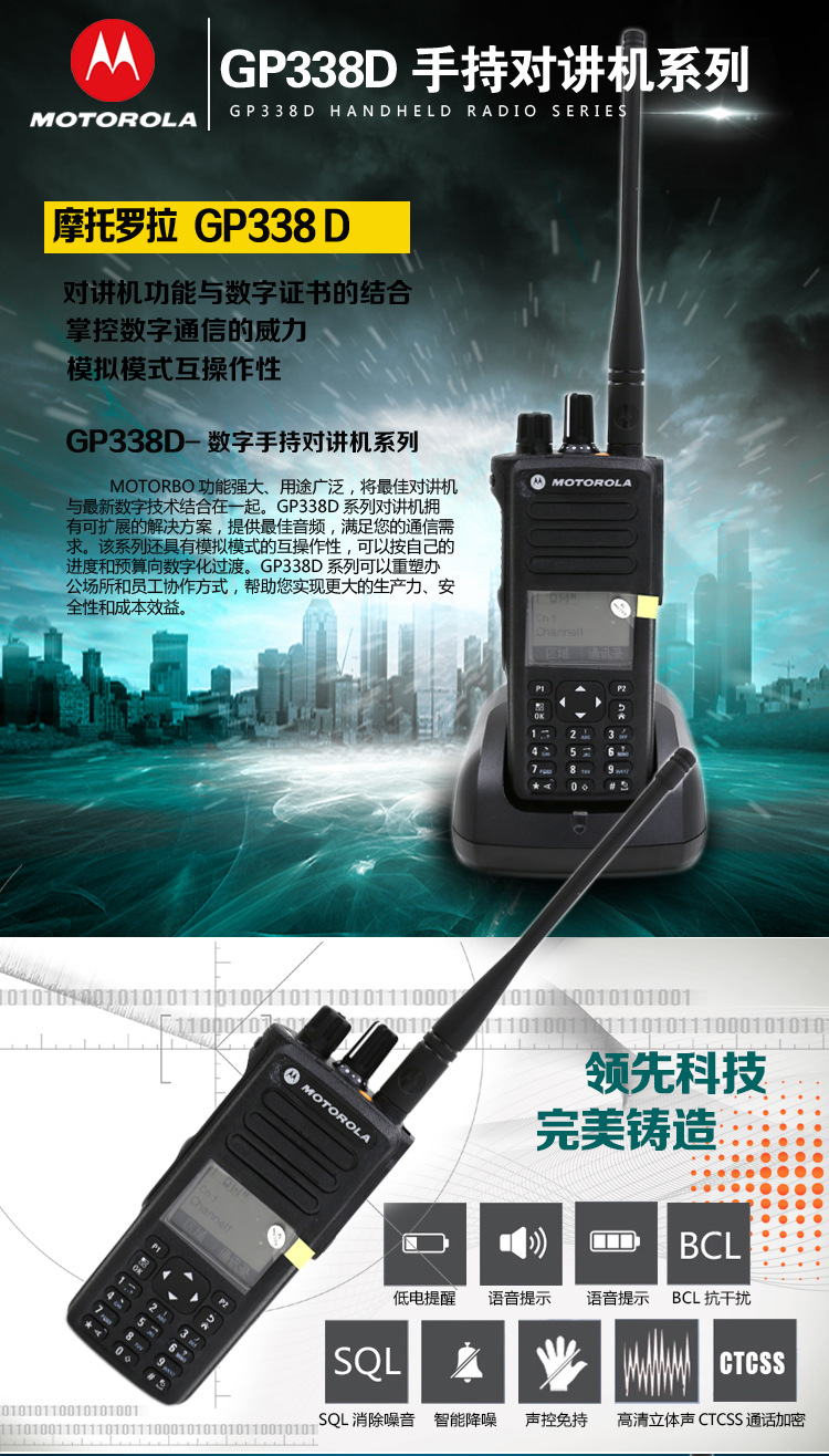 MOTOTRBO功能强大、用途广泛,将**对讲机功能与**数字技术结合在一起。GP338D手持对讲机无缝集成了语音和数据,提供易于使用的增强型功能和业务关键优势,如智能音频。