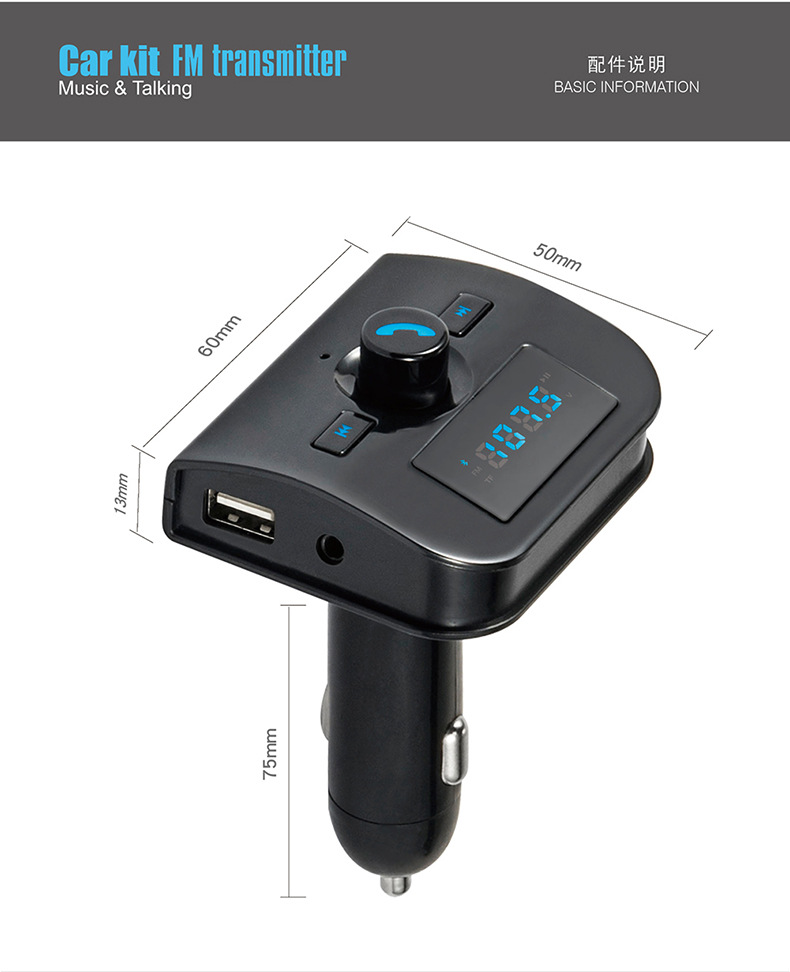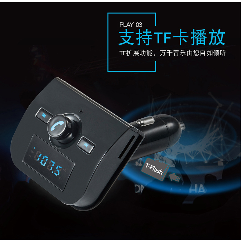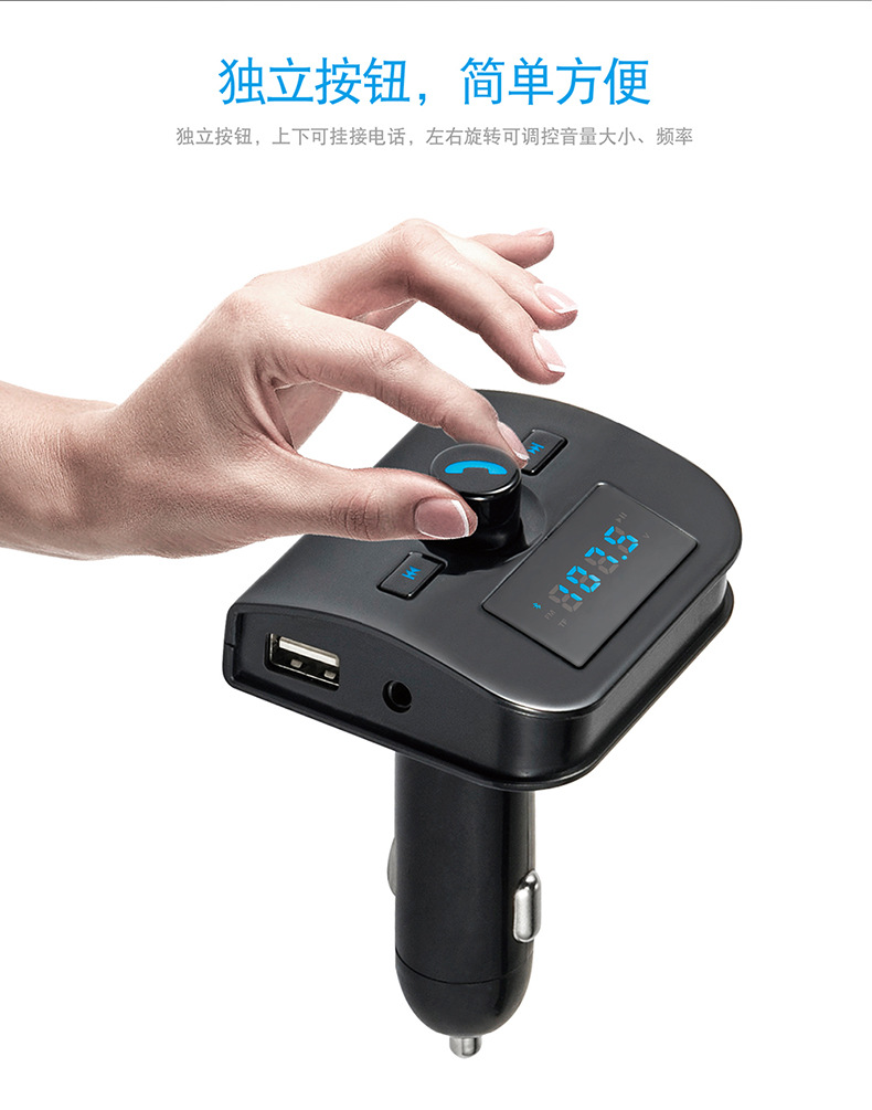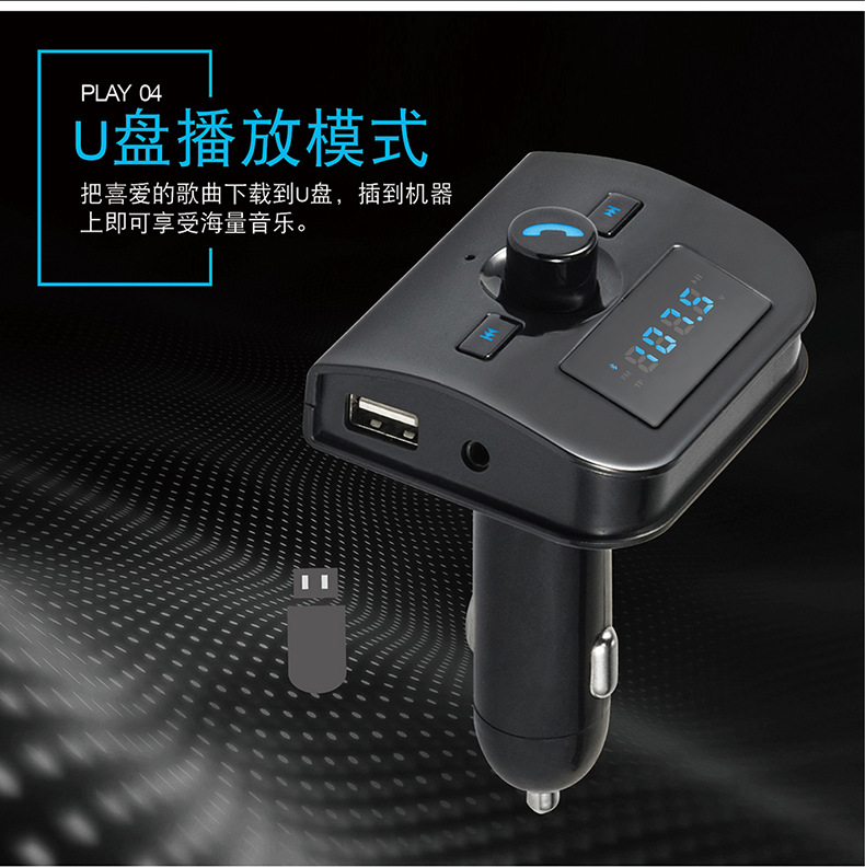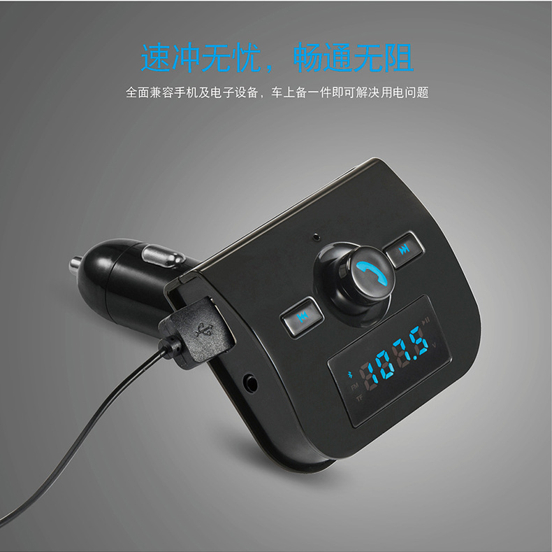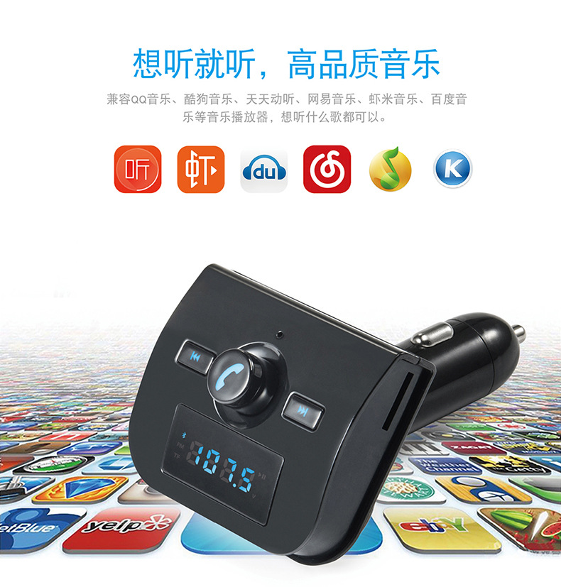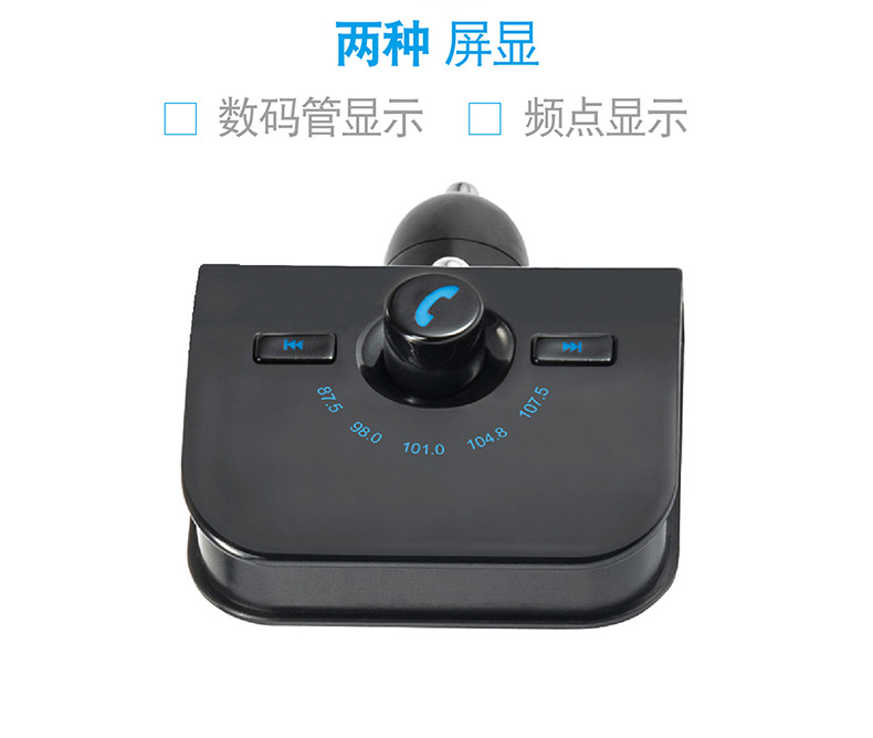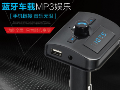 本产品为汽车蓝牙车载MP3播放器,采用高性能专业级的蓝牙模块,MP3解码芯片,高保真、低背噪发射芯片,能够播放TF卡音乐文件。通过无线发射到汽车音响,如果用户手机带蓝牙功能则可以使用蓝牙功能将机器自动切换到免提通话的状态,通话结束后又自动切回到音乐播放状态,还可以将您手机里的MP3音乐通过无线发射的方式发射到您的汽车音响,不需要改装您的爱车即可轻松使您的驾驶途中既可以享受音乐又可以免提使用手机通话,娱乐两不误。