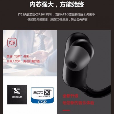 luusmm雳声运动型蓝牙耳机SY11-1自去年年底上市以来,受到了广大音乐爱好者的**和认可。是音乐发烧友的**!高保真音质 超低音配备 时尚精美的外观设计 突破传统耳机的智能设计英国进口芯片CSR-V4.1 配对速度与降噪和省电的蓝牙**先进的技术降辐射材料制作!是雳声SY11的升级版 1.可同时支持连接两部手机【即一拖二功能】 2.蓝牙版本的提升至4.1 3.更省电:待机时间约100小时,通话时间约4小时,音乐播放时间约4小时 5. 提高音质,声音更震撼 6. 支持DSP回音消除,让高清与你同行。