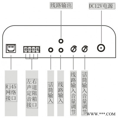 5、本地具有一个双声道线路输入接口、一个话筒输入接口,一个线路输出接口,在本地能外接话筒以及线路输入设备进行本地扩声,能对本地话筒及线路输入音量进行调节,能输出至功放进行扩声;