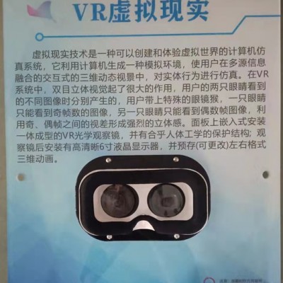 展示原理:虚拟现实技术是一种可以创建和体验虚拟世界的计算机仿真系统,它利用计算机生成一种模拟环境,使用户在多源信息融合的交互式的三维动态视景中,对实体行为进行仿真。在 VR 系统中,双目立体视觉起了很大的作用,用户的两只眼睛看到的不同图像时分别产生的,用户带上特殊的眼镜猴,一只眼睛只能看到奇帧数的图像,另一只眼睛只能看到偶数帧图像,利用奇、偶帧之间的视差形成强烈的立体感。面板上嵌入式安装一体成型的 VR 光学观察镜,并有合乎人体工学的保护结构;观察镜后安装有高清晰 6 寸液晶显示器,并预存(可更改)左右格式三维动画。
